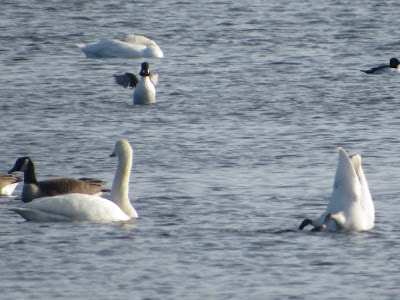 Today Travalon and I had another lazy day, then we went to Picnic Point to see if the tundra swans are still around. Answer: yes! Along with Canada geese, mallards, and goldeneyes.