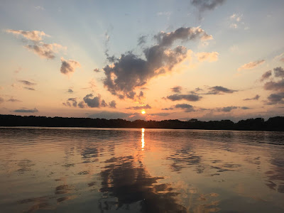 When I went for a lunchtime rosary walk, my neighbor who seems to have memorized my walking schedule was ready to pounce. "Can I join you?" So much for the rosary... Another neighbor is actually the mother of a famous, long-dead comedian, and she saw us and started talking to us too. I was wearing a Bucks shirt, so she said, "Wasn't that game exciting?!" because it really was - the Bucks won in the last few minutes - and I couldn't believe I was discussing a basketball game with a really famous guy's mother. (His brother lives there too, and he looks just like him, only middle-aged, since this guy was unfortunately quite young when he died.) Then when Travalon came home, we took a long, lovely boat ride. It was an absolutely perfect night. Here are some photos of the sunset.