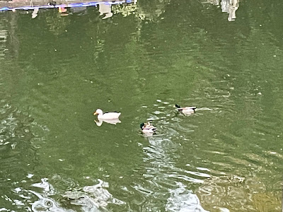Today my neighbor told me she went to lunch at a place called Breakwater and they had really good wings, so Travalon and I went there for dinner tonight. It was the place near my old apartment on Pirate Island, and we sat out on the balcony overlooking the river. Because of the dreary weather and the fact that it was Monday, no other people were outside, so I hoped we might see some birds. We did! We saw this white duck hanging out with some mallards.
